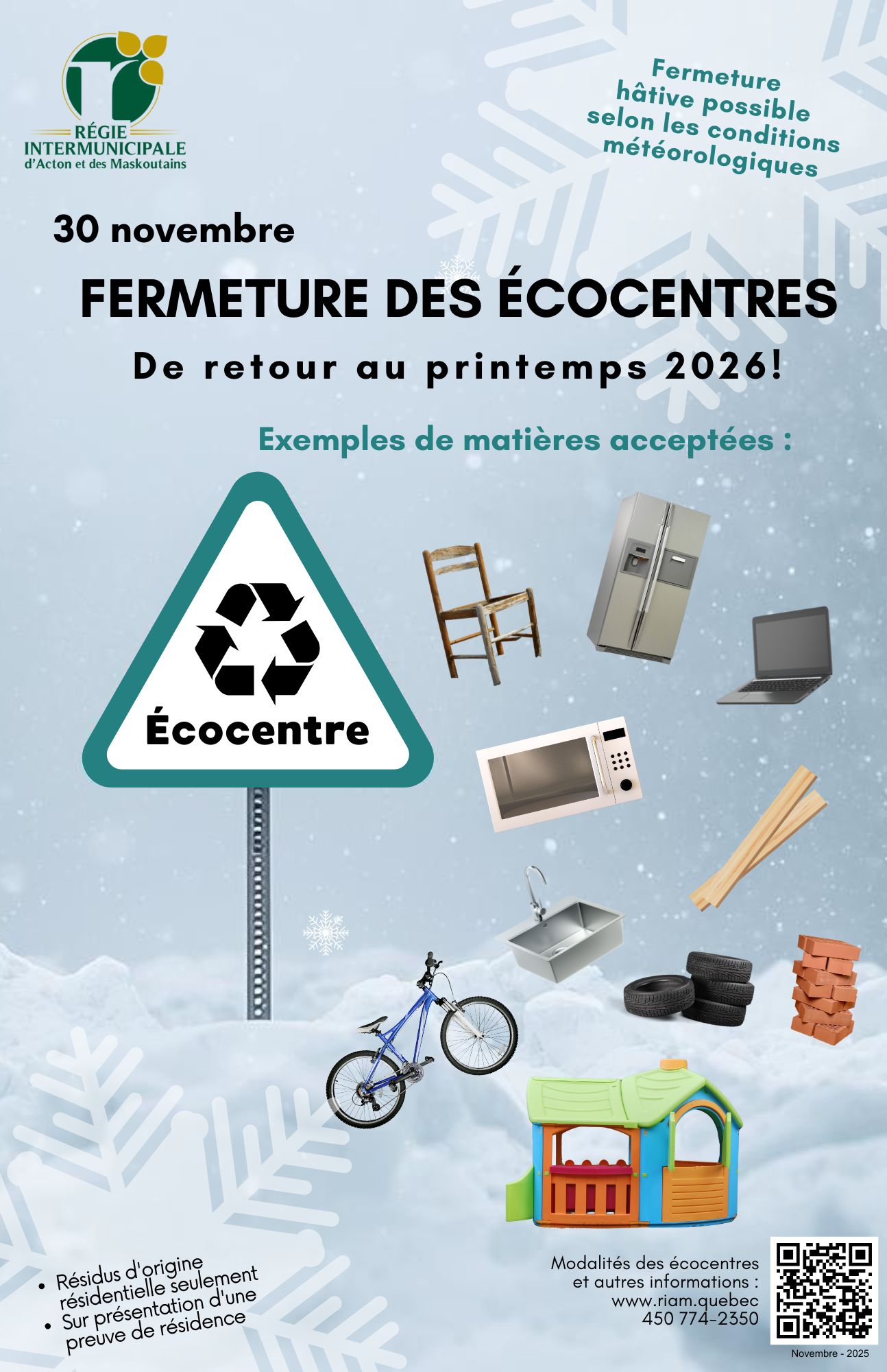 Fermeture des écocentres: 30 novembre 2025
