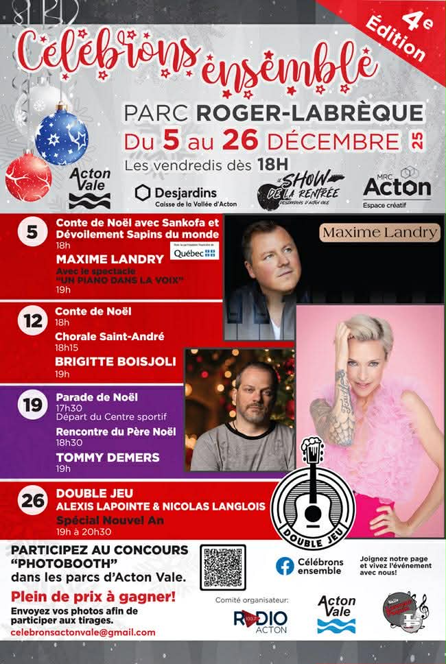 Acton Vale, le 6 novembre 2025 – Un comité organisateur composé de représentants de la Ville d’Acton Vale et de plusieurs organismes — dont les Productions Artistiques de la région d’Acton (P.A.R.A.), Radio-Acton et le Show de la Rentrée Desjardins d’Acton Vale — s’unit afin d’animer le centre-ville d’Acton Vale tout au long du mois de décembre.