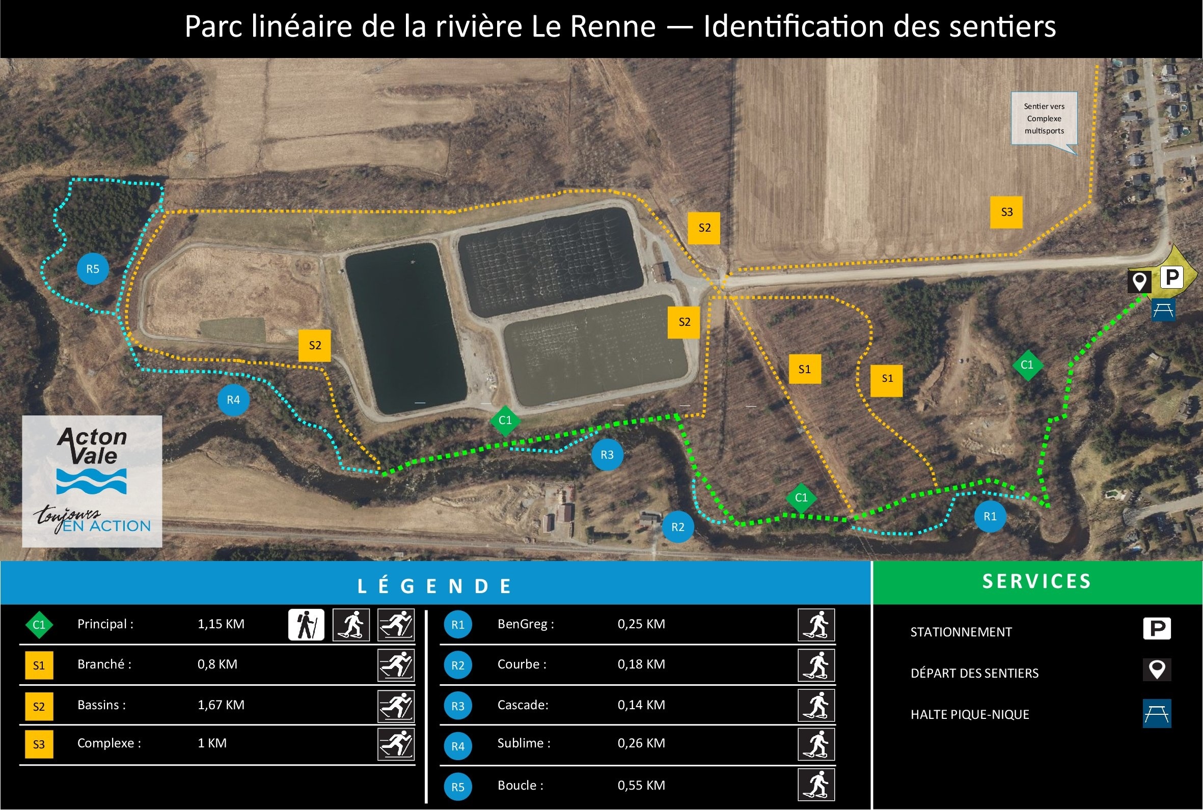 La relocalisation complète des sentiers de ski de fond constitue un élément central de ce projet. Désormais, ces parcours se déroulent entièrement sur les terrains appartenant à la Ville et n’empruntent plus les installations du club de golf d’Acton Vale, assurant une pratique sécuritaire et pleinement adaptée aux activités hivernales.
