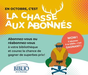 En octobre, les bibliothèques membres du Réseau Biblio Montérégie déploient le concours La chasse aux abonnés. Les citoyens d’Acton Vale, de Saint-Nazaire d’Acton et de Sainte-Christine peuvent donc participer. Abonnez-vous