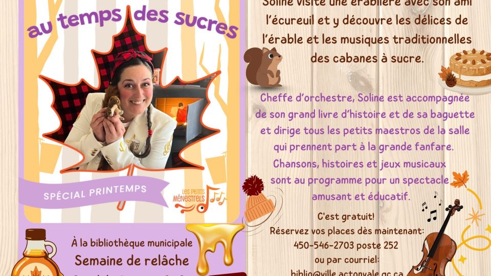 Présenté par Les petits ménestrels. Soline visite une érablière avec son ami l’écureuil et y découvre les délices de l’érable et les musiques traditionnelles des cabanes à sucre. Cheffe d’orchestre, […]