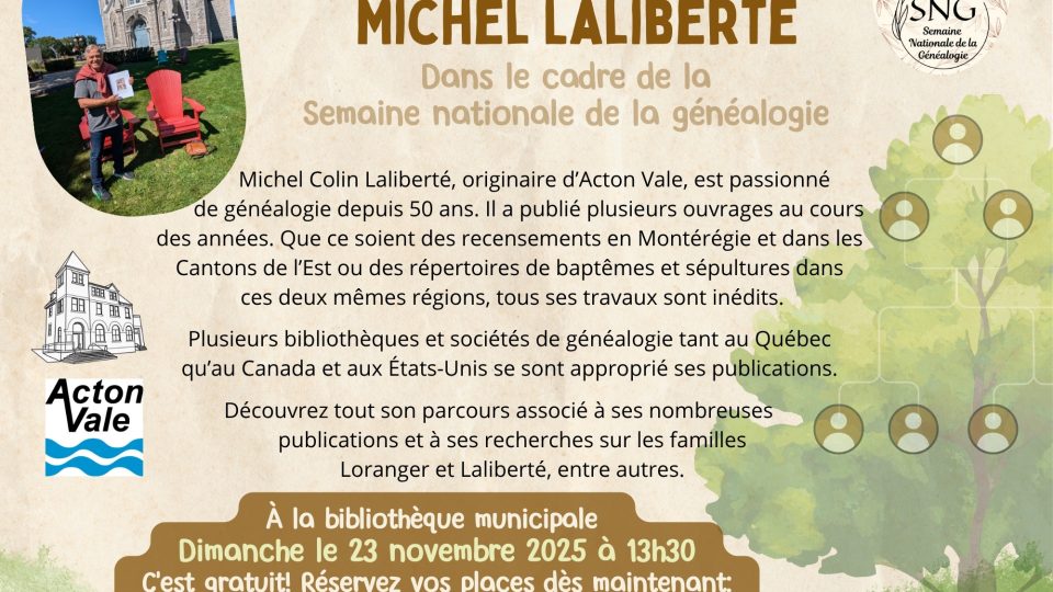 Michel Colin Laliberté, originaire d’Acton Vale, est passionné de généalogie depuis 50 ans. Il a publié plusieurs ouvrages au coursdes années. Que ce soient des recensements en Montérégie et dans […]