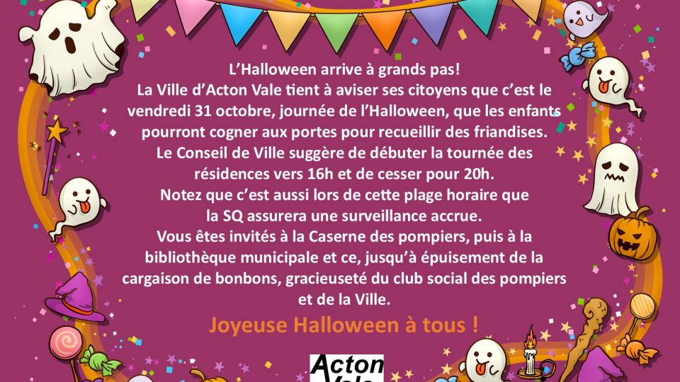 L’Halloween arrive à grands pas! La Ville d’Acton Vale tient à aviser ses citoyens que c’est le vendredi 31 octobre, journée de l’Halloween, que les enfants pourront cogner aux portes […]