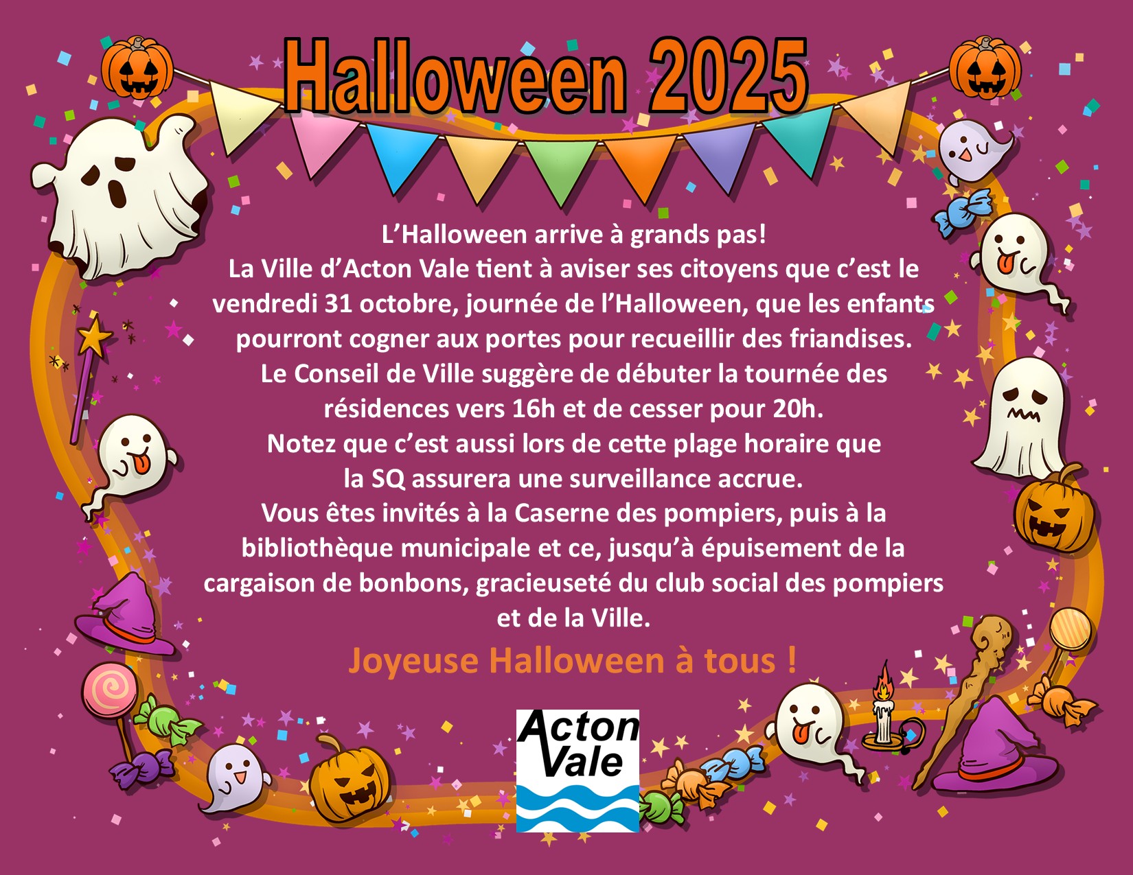 L’Halloween arrive à grands pas! La Ville d’Acton Vale tient à aviser ses citoyens que c’est le vendredi 31 octobre, journée de l’Halloween, que les enfants pourront cogner aux portes pour recueillir des friandises. Le Conseil de Ville suggère de débuter la tournée des résidences vers 16h et de cesser pour 20h. Notez que c’est […]