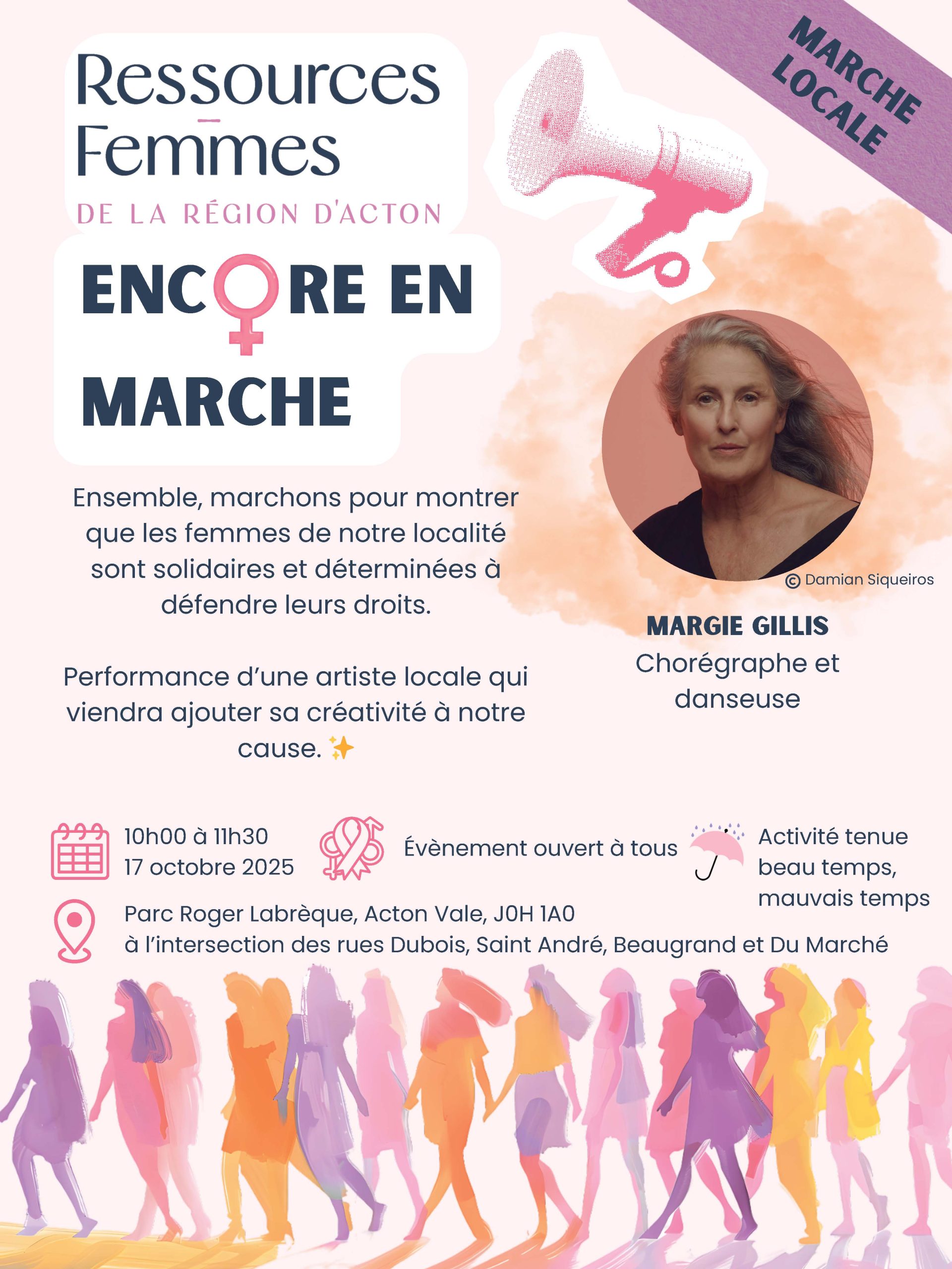 Une initiative de Ressources-Femmes de la région d'Acton. Ensemble, marchons pour montrer que les femmes de notre localité sont solidaires et déterminées à défendre leurs droits. Performance de Margie Gillis, artiste locale. Activité tenue beau temps, mauvais temps. Départ au parc Roger-Labrèque (derrière la bibliothèque), à 10h.