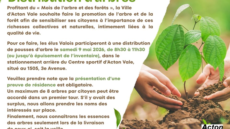 Profitant du « Mois de l’arbre et des forêts », la Ville d’Acton Vale souhaite faire la promotion de l’arbre et de la forêt afin de sensibiliser ses citoyens à