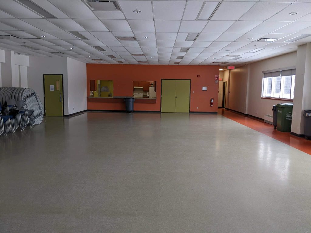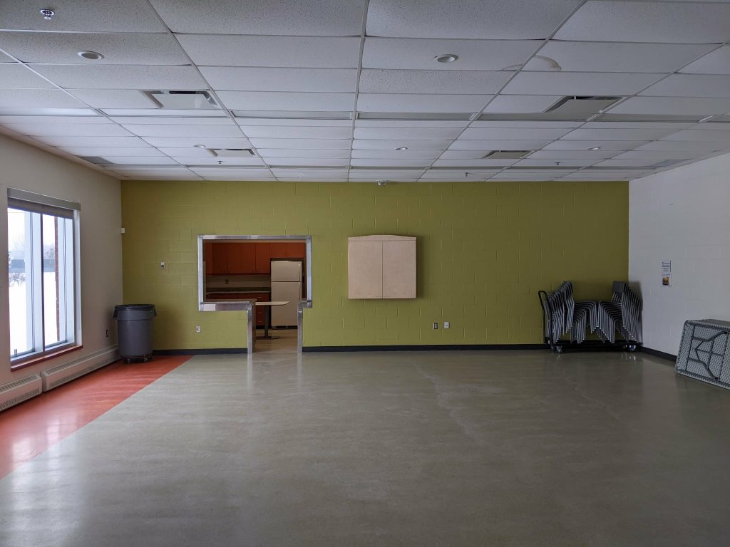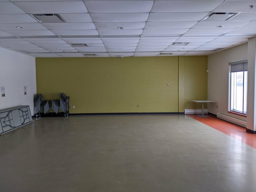 Capacité : 50 personnes / Dimensions : 21ˈ x 34ˈ / Tables (rectangulaires) et chaises sur place / Cuisinette avec lavabo, micro-ondes et petit frigo / Au sous-sol